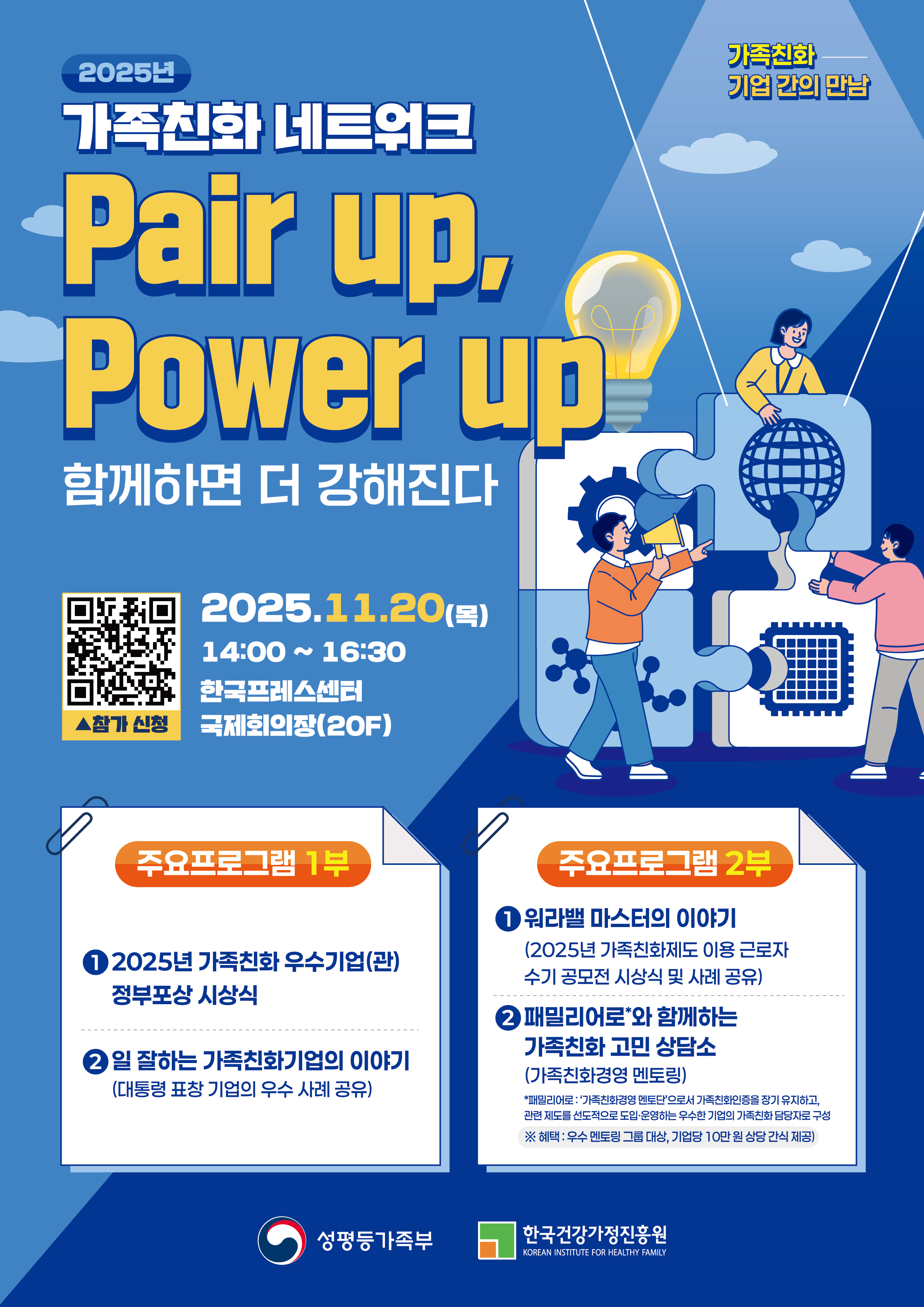 [주요 프로그램] 1. 2025년 가족친화 우수 기업(대통령 표창)의 가족친화경영의 사례를 직접 들어볼 수 있는「일 잘하는 가족친화기업의 이야기」 2. 가족친화제도를 이용한 근로자의 사례를 직접 들어볼 수 있는 「워라밸 마스터의 이야기」 3. 패밀리어로의 가족친화제도 운영 노하우 전수 및 가족친화 담당자로서의 애로사항을 해결할 수 있는「가족친화 고민 상담소」 * 패밀리어로의 실무적인 조언, 가족친화 컨설턴트의 전문적인 코칭으로 고충 해결 중심의 기업 간 멘토링 진행 |